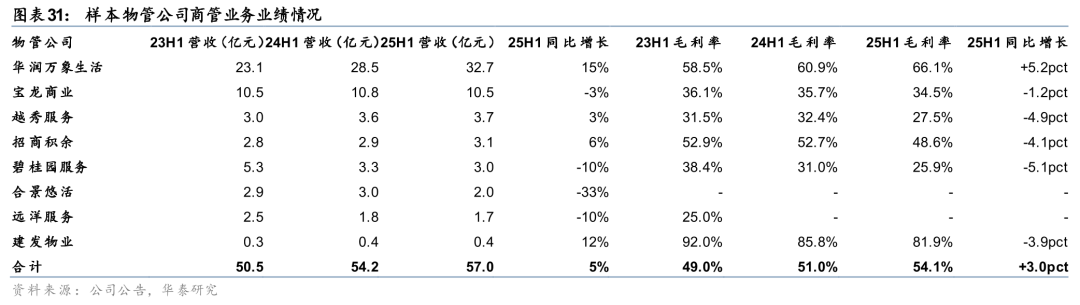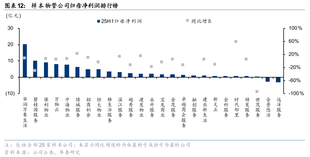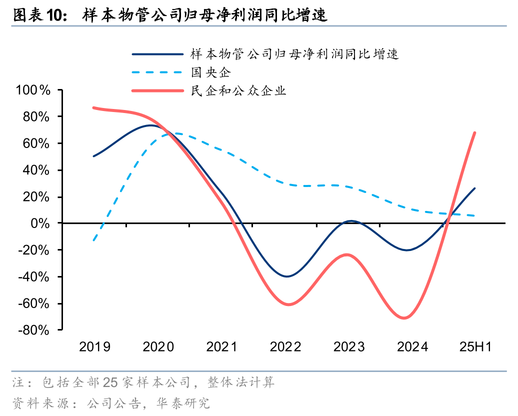 25H1样本物管公司实现营收1293亿元,同比增长5%,增速较24年持平。其中,国央企、民企物管公司分别同比+8%、+3%,增速较24年-2pct、持平。样本物管公司实现归母净利润88亿元,同比增长26%,增速较24年+46pct。其中,国央企、民企物管公司分别同比+5%、+68%,较24年-6、+137pct。