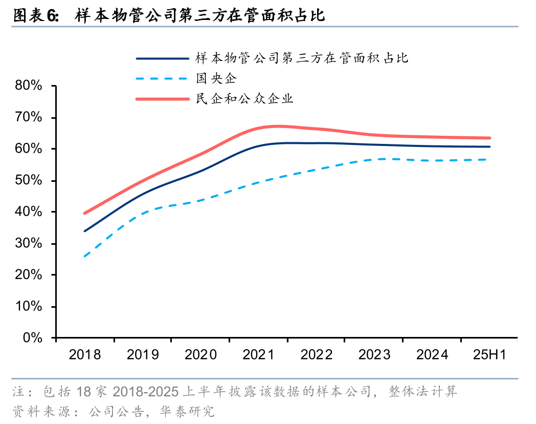 25H1样本物管公司在管面积同比增速放缓至4%,较24年-3pct。物管公司普遍提升市拓准入门槛,重点聚焦核心城市的优质项目,非理性竞争有所减少;同时,继续退出低盈利、低回款或非重点城市的零散项目,包括部分存在降价压力、交付质量较差的项目,单城市管理面积继续增长。样本物管公司第三方/非住宅在管面积占比稳定在61%/32%,国央企在非住宅业态拓展上相对民企更加积极。