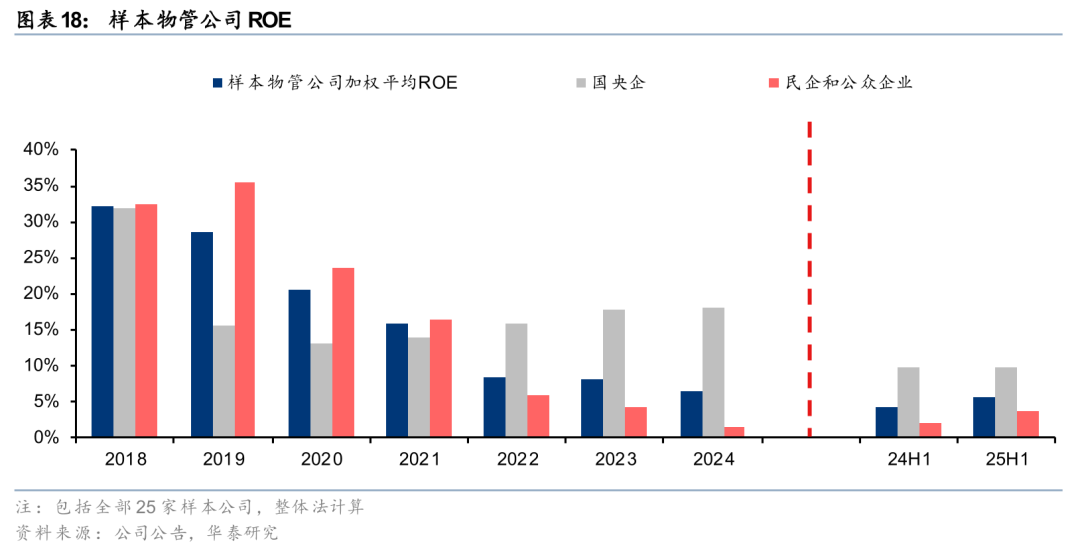 25H1样本物管公司销售管理费用率为7.0%,同比-0.5pct。其中,国央企、民企销售管理费用率分别为5.1%、7.9%,同比分别-0.4、-0.5pct。样本物管公司归母净利率为6.8%,同比+1.2pct。其中,国央企、民企物管公司归母净利率分别为12.1%、4.4%,同比分别-0.4、+1.7pct。样本物管公司加权平均ROE为5.5%,同比+1.2pct。其中,国央企、民企物管公司加权平均ROE分别为9.8%、3.6%,同比持平、+1.5pct。