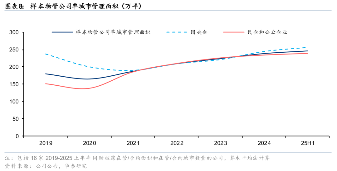 25H1样本物管公司单城市管理面积为246万平,同比+5%,增速较24年-1pct。其中,国央企、民企物管公司单城市管理面积分别为256、239万平,同比+8%、+4%,增速较24年-2pct、持平。