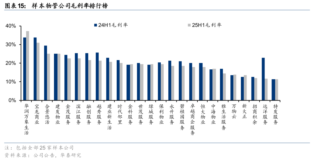 25H1样本物管公司单城市管理面积继续提升,与市拓严准入和存量项目“断舍离”的趋势相匹配。与房企拿地向核心城市集中的趋势类似,多数物管公司已告别全国化的规模扩张,在项目拓展时对城市做了收敛聚焦,强调核心城市深耕,主动退出项目较少、潜力有限的低效城市。一方面,项目密度的提升有助于物管公司提升基础物管毛利率、节约销售管理费用,同时探索更多社区增值服务的可能;另一方面,核心城市项目在回款质量等方面相对更有保障。