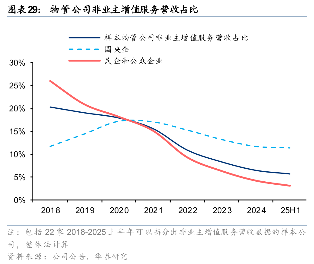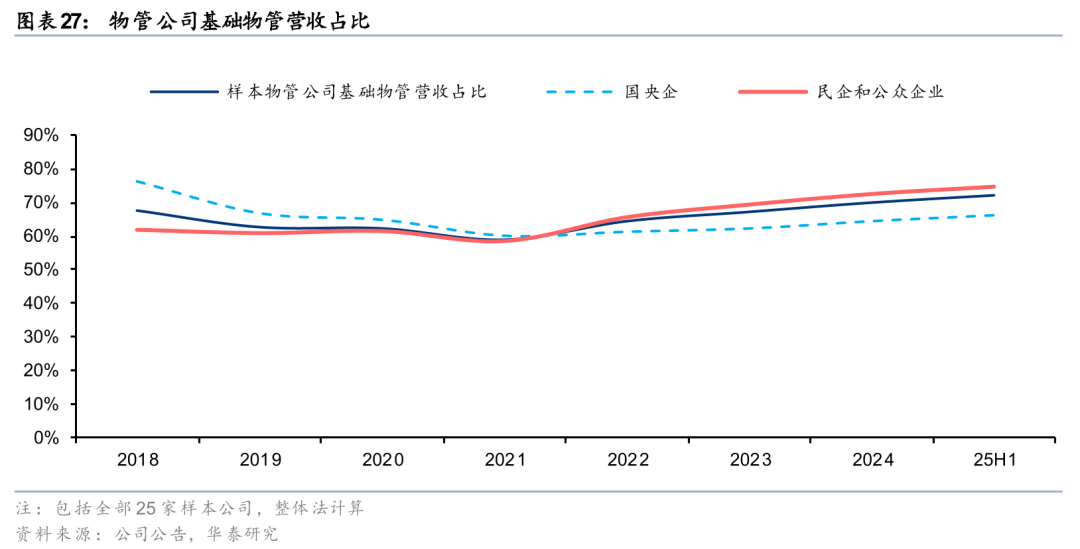 综合考虑物管公司数据披露和营收规模的情况,我们选取25家已披露2025半年报、2024年营收超过20亿元的上市物管公司(下称“样本物管公司”)进行财报综述。25家公司占到板块总市值的90%,我们认为具有较强的代表性。同时,我们按照企业属性对于样本公司进行分组:共包括8家国央企,17家民企和公众企业。由于上市物管公司历史数据披露范围通常从2018年开始,我们将本次综述的时间范围定为2018-2025上半年,尽可能在时间维度确保统计口径的连贯性。由于不同物管公司披露口径不尽相同,各个图表覆盖的样本公司数量有所差异,请留意图表附注。
