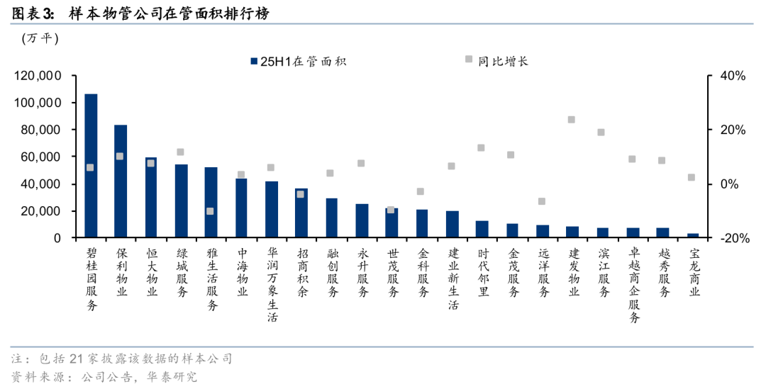25H1披露了在管面积的21家样本公司中,16家实现同比增长,5家同比下滑。碧桂园服务仍为在管面积最大的样本公司,达到10.6亿平;建发物业在管面积同比增长23%,增速最快。