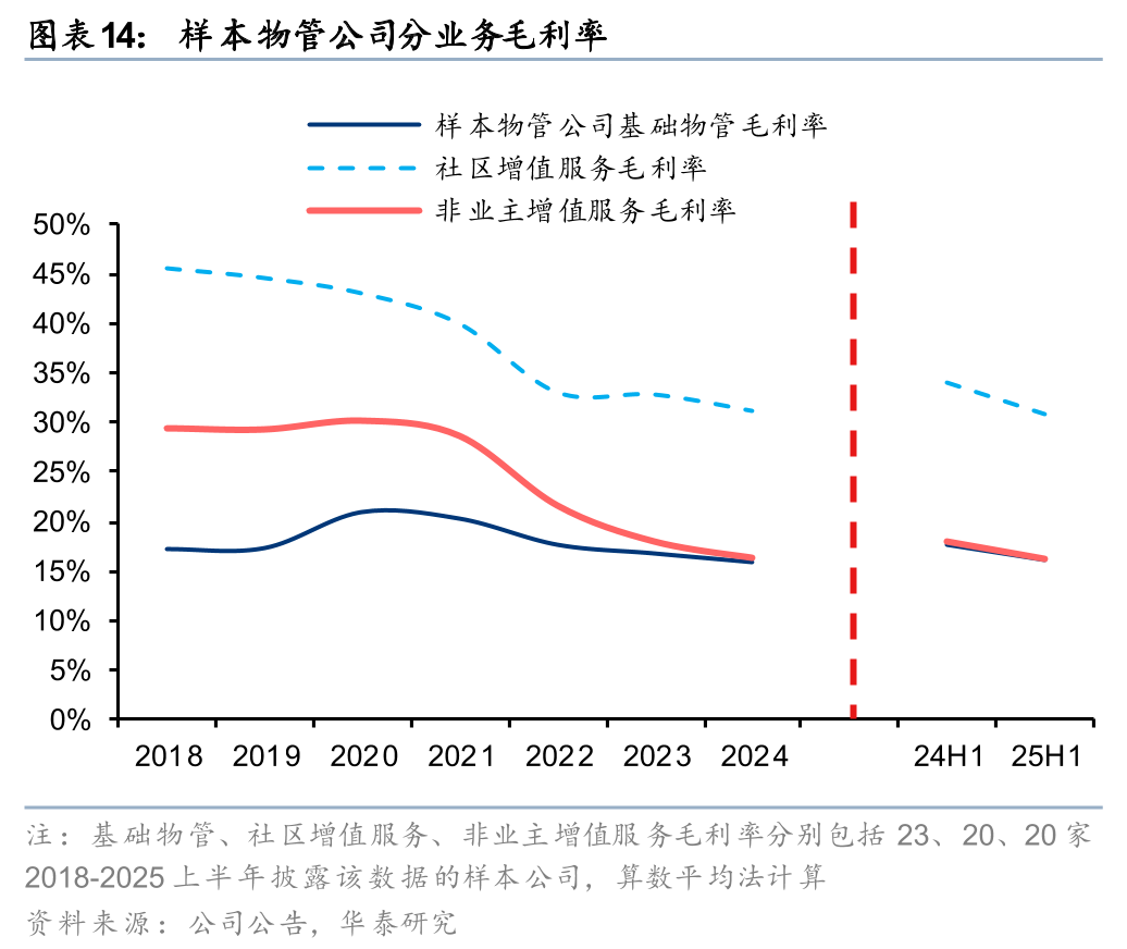25H1样本物管公司毛利率同比延续下滑。分业务板块来看,三大业务毛利率均出现同比下滑,其中基础物管服务主要受市场竞争、品质投入提升等因素影响,社区增值和非业主增值服务主要受经济环境和地产调整影响。分企业属性来看,国央企物管公司毛利率同比仅小幅下滑,仍然更具韧性,且自23H2以来继续超越民企。