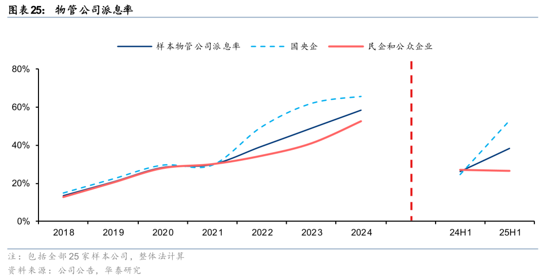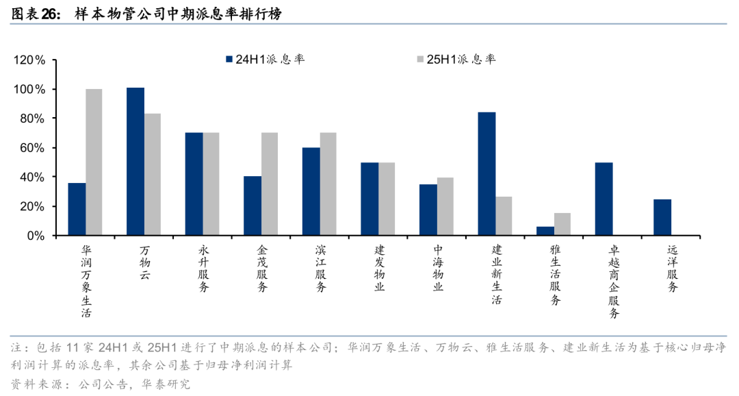 25H1样本物管公司派息率为38%,同比+12pct。其中,国央企、民企物管公司派息率分别为53%、27%,同比+29pct、持平。24H1或25H1有过中期派息的11家样本物管公司中,5家提升中期派息率,但也有4家下调中期派息率(其中2家暂停中期派息)。