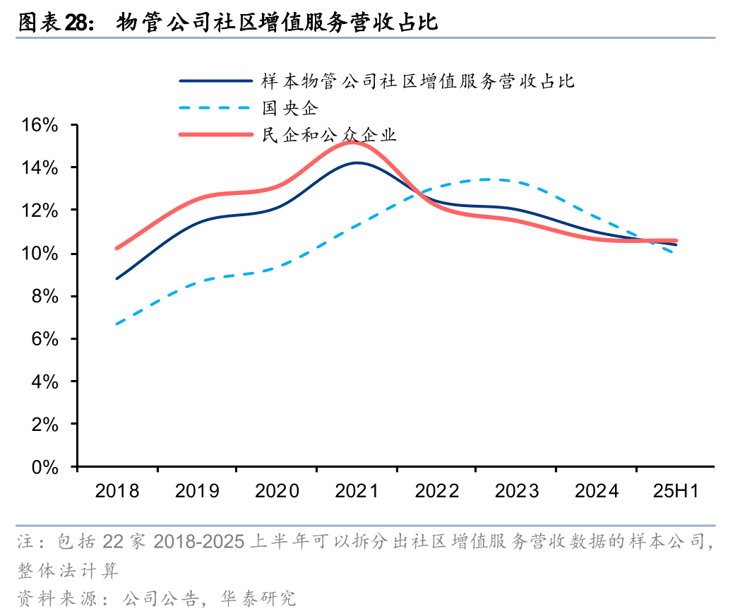 25H1共有12家样本物管公司单独披露了城市服务的分部数据,总体来看营收同比-10%,毛利率同比-2.4pct至12.9%。25H1经济和财政环境对于城市服务而言仍偏逆风,该业务继续面临政府回款放缓和利润率下行的压力。样本公司普遍收紧了项目拓展标准,更加聚焦财政状况相对较好的区域,战略取向延续分化。头部央国企物管公司得益于集团资源、对接层级等方面的禀赋优势,在城市服务扩张方面相对更为积极,例如保利物业公服业态新拓展第三方项目单年合同额同比+12%,华润万象生活城市空间营收同比+15%;而民企更多持审慎态度,战略上以收缩为主,多家公司该业务营收出现同比下滑。