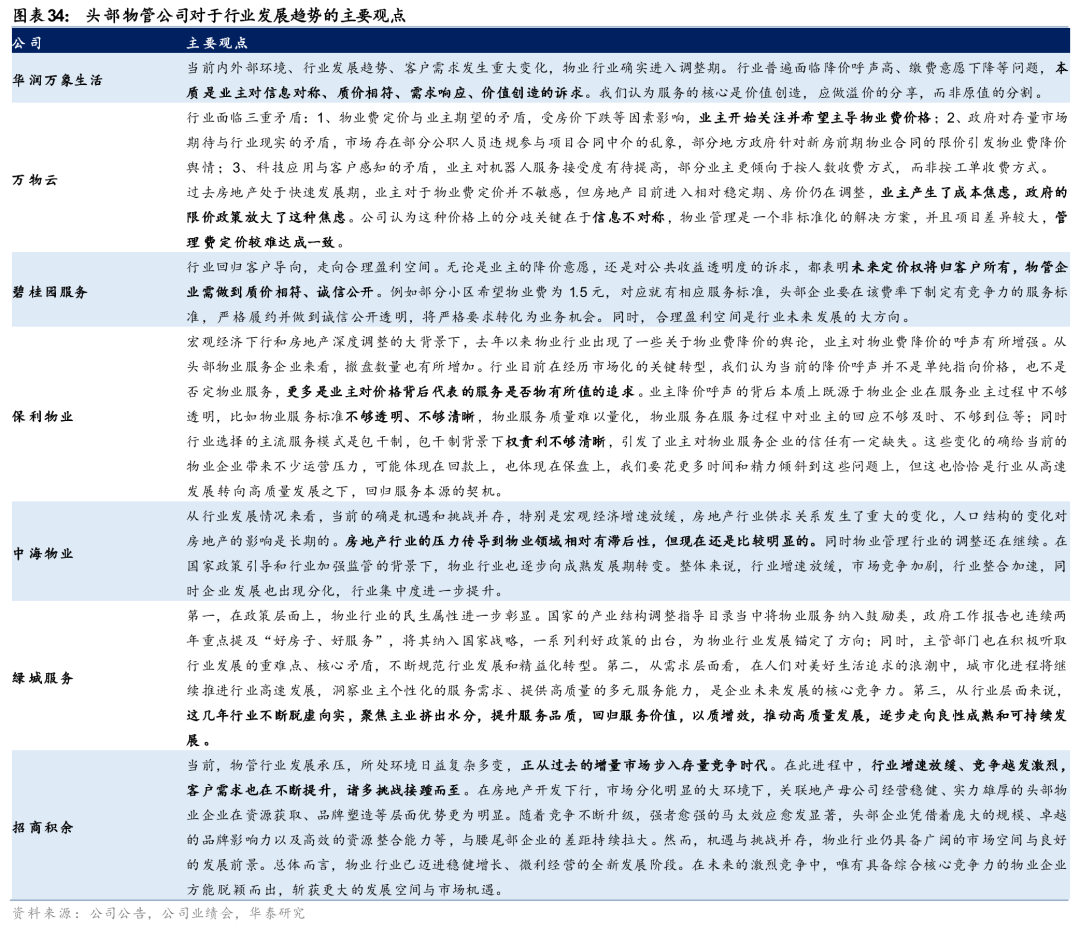 头部物管公司普遍认为,物业费降价并不是单纯指向价格问题,更不是完全否定物管行业,其本质反映的是经济环境和房价调整背景下,业主产生成本焦虑,进而对于物管服务的信息对称、质价相符、需求响应、价值创造提出了更高的要求。解题的关键,一是需要物管公司提升服务内容和成本的感知度、透明度,提供质价相符、优质优价的好服务;二是需要等待经济环境的继续回暖和房价表现改善,缓解业主的成本焦虑。总体而言,综合实力更强、服务品质更优的头部物管公司有望化挑战为机遇,在保障存量项目物业费和收缴率稳定的同时,抓住更多小区更换物管公司的时机,获取更多市场份额。