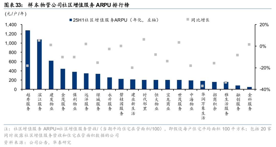 25H1可以计算该数据的20家样本公司中,6家公司社区增值服务ARPU同比上升,14家同比下降。越秀服务、滨江服务社区增值服务ARPU为2554、2154元/户/年,显著高于其它样本公司,其中滨江服务实现同比正增长,主要来自新房装修业务的驱动。