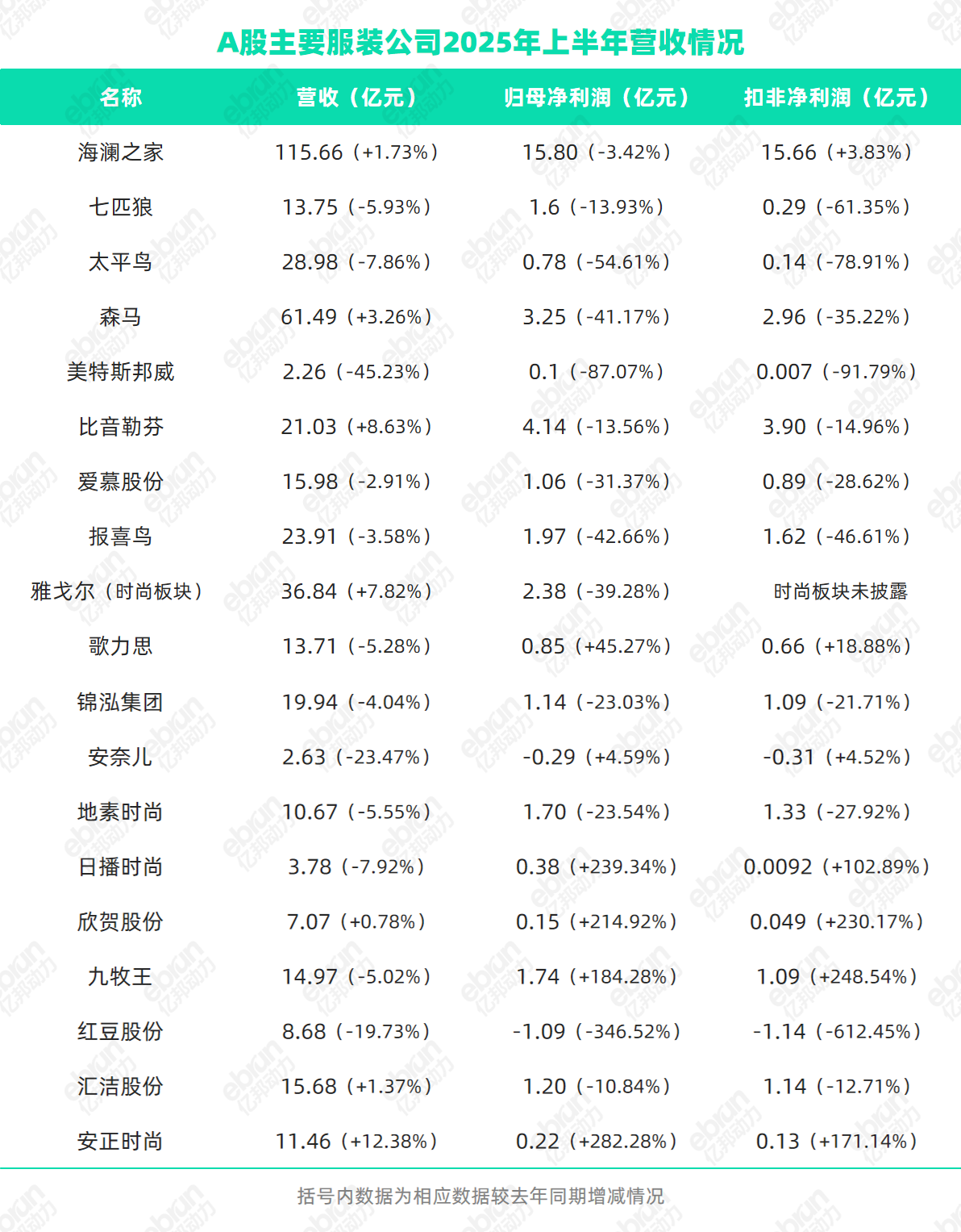 这既是品牌起伏波动的缩影,也折射出服饰行业的普遍困境。今年上半年,中国社会消费品零售总额同比增长5.0%,服饰类零售额同比增长为3.1%,弱于社零大盘。亿邦动力梳理19家A股服饰品牌半年报发现,总营收428.49亿元下降1.37%,归母净利润37.08亿元下降19.11%(去年同期45.84亿元,减少8.76亿元)。