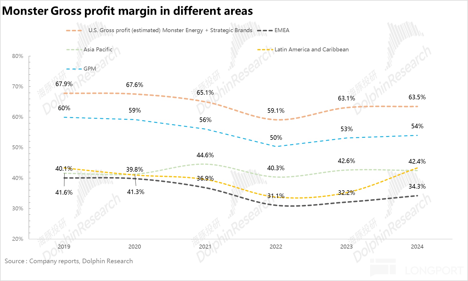 毛利率上,从下图可以看到,由于 Monster 在海外地区的定价仅是国内的一半,再加上目前 Monster 在海外地区的生产基本外包给可口可乐的瓶装厂,生产的提成较高,以及原材料的采购、物流、仓储成本都要比美国本土要高,因此 Monster 海外地区的毛利率比国内市场要低出接近 20 个百分点。