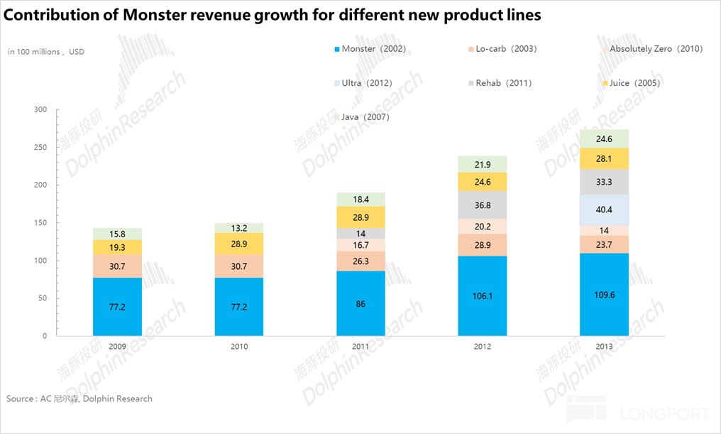 而对于 Monster,虽然不同于红牛依赖少数经典 SKU 打天下,Monster 从 2002 年推出经典系列后,每年也会通过加法(与咖啡,茶,果汁等其他软饮结合或是在其中直接添加蛋白质,电解质等功能性成分而从而获得新的口感和功效)和减法(降低糖和碳水化合物的含量推出更健康的饮品,适用于肥胖和不能摄入过多糖分的消费者)稳定推出 1-4 款新品,产品线也比较丰富,但基本盘仍然是高糖、高咖啡因的经典能量饮料,产品体系在这轮健康化浪潮中并没有及时进行针对性的调整,这也是 Monster 份额被蚕食的核心原因。