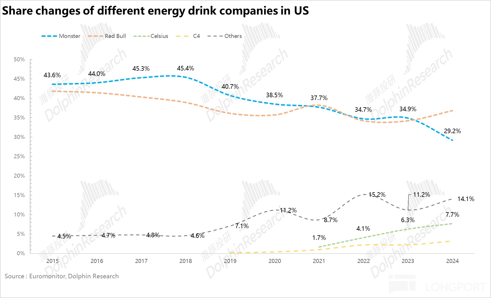 从下图可以看到,2019 年开始,Monster 的市场份额开始明显下滑,截至 2024 年底,Monster 在美国的市场份额已经从最高 43.6% 降至 29.2%。对应地,从 Monster 的业绩上看,2024 年的营收仅增长了 4.9%,跑输了尼尔森口径行业 7% 的增速。