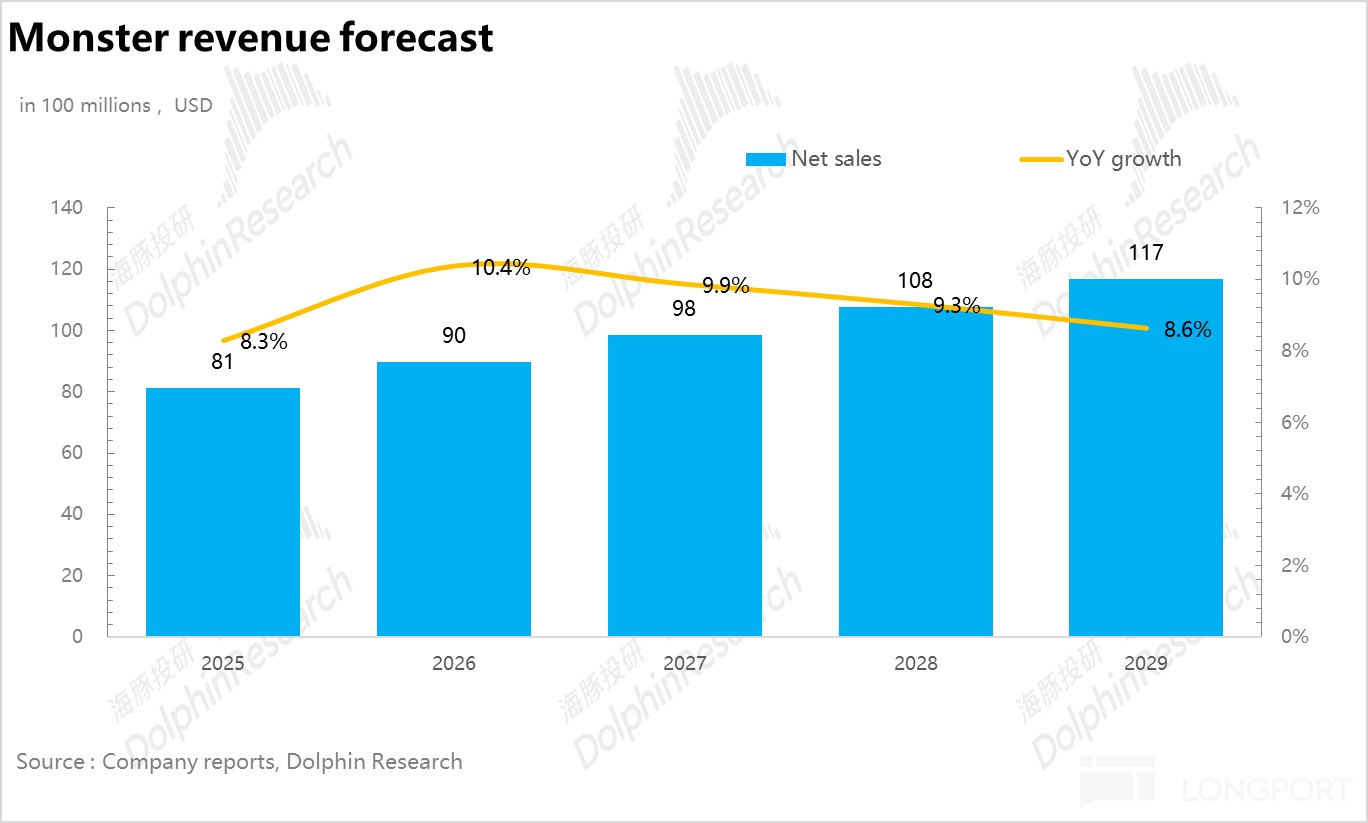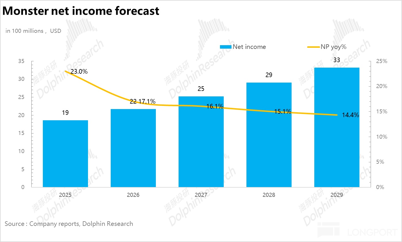 最终,经营利润率从 26% 提升到 33%,基于上述假设,未来 5 年 Monster 利润端的增速为 17%。