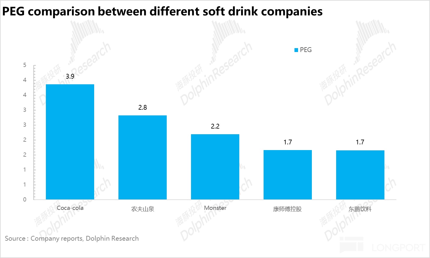 另一方面,从同行对比角度来看,剔除掉成长性对估值的影响,从 PEG 的角度可以看到 Monster 的 PEG 在 2 以上,隐含了比较强的未来成长的永续性,说明资金要求它在美国本土不掉链子的基础上,海外市场也要持续高速成长很多年。