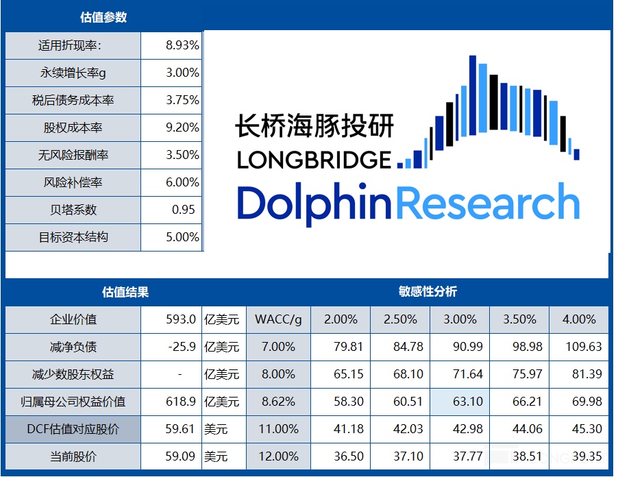 而从绝对估值的角度,WACC 我们测算给到 8.93%,最后按照 Monster 未来永续增速 3% 的情况下测算出 Monster 的合理市值为 619 亿美元,与当前的股价基本一样,只有 0.9% 的溢价空间。