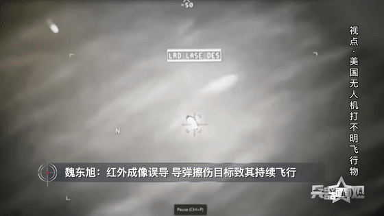 航拍画面显示,一个“物体”高速直线飞行,一架“死神”无人机向其发射“海尔法”导弹并命中,但该“物体”似乎并未受到导弹影响,仍朝着原有方向继续飞行,疑似被导弹击中后脱落的碎片也跟着继续飞行。