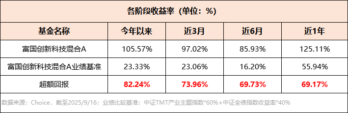富国创新科技混合的业绩自然很给力,A类份额近一年收益率125.11%,今年以来收益率105.57%,近6个月收益率85.93%。(数据来源Choice,截至2025/9/16)