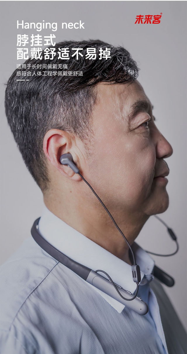 未来客0101B采用独特的围脖式设计,佩戴稳固,能够有效防止丢失,特别适合记忆力较差的老人。其开放式耳塞设计,长时间佩戴也不会感到不适。