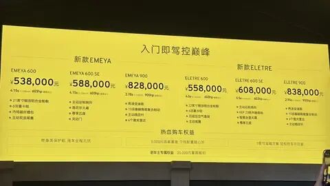 动力部分,新车继续采用双电机四驱系统。其中,600和600SE车型的最大动力为450kW/710N·m,匹配单挡变速箱,最高车速可达 250 公里 / 小时,0-100 公里 / 小时加速时间为 4.5 秒。900车型为675kW/985N·m,0-100km/h加速时间分别为4.5秒和2.95秒,动力电池容量为112kW,600和600SE的CLTC续航里程为650km,900车型CLTC续航里程为560km。
