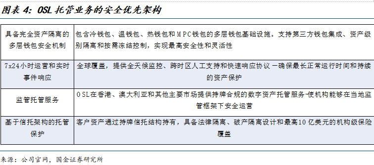 托管业务:OSL在中国香港、澳大利亚和其他主要市场提供持牌合规的数字资产托管服务,具备完全资产隔离的多层钱包安全机制,且客户资产通过持牌信托机构持有,具备法律隔离、破产隔离设计和最高10亿美元的机构级保险覆盖。托管的对象涵盖加密货币、公链资产和RWA代币。当前客户涵盖对冲基金、交易公司、交易产品发行人、交易所等。2024年4月,6支虚拟资产现货ETF在港交所正式敲钟上市并开放交易,其中华夏基金(香港)、嘉实国际发行的4支ETF均与OSL合作进行虚拟资产托管服务。此外,2025年7月,潘渡资产管理有限公司最新推出的比特币现货ETF正式于香港交易所挂牌交易,OSL为潘渡比特币ETF提供托管与交易基础设施。