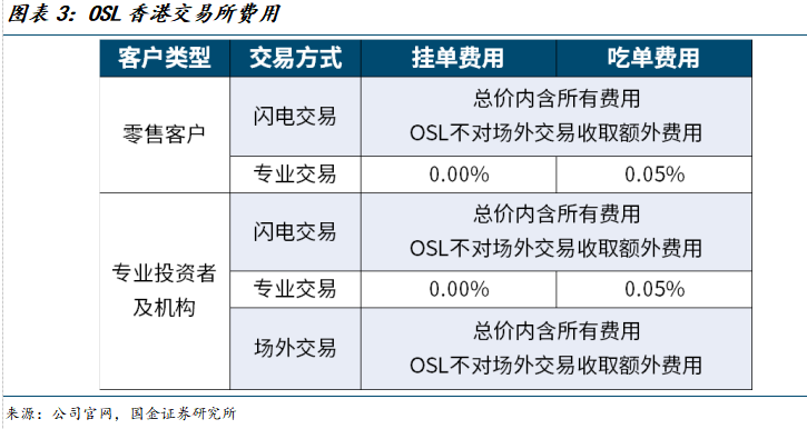 智能询价、交易所:当前OSL香港交易所对所有投资者(零售、专业投资者、机构)挂单(指以特定价格下单,但该订单未立即与订单簿中的对手方订单成交,而是进入订单簿,等待对手方订单的成交)收取零费率,吃单(指以特定价格下单,并立即与订单簿中的对手方订单成交)收取0.05%费率。针对专业投资者和机构,另外收取0.05%的月度存仓费。