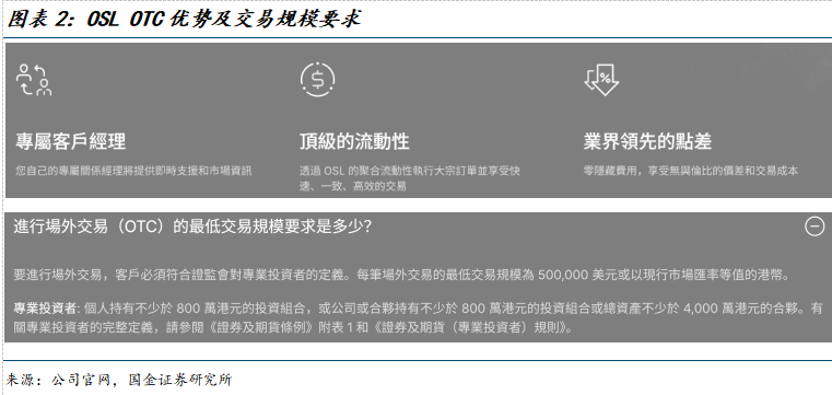 场外交易业务:场外交易指客户向OSL提出特定交易请求,经OSL确认后,与客户进行交易,此类交易不通过订单簿进行。其中,闪电交易是场外交易的一种,指OSL为客户提供报价,且交易仅在客户确认后执行。公司数字资产平台包括一整套的机构级经纪服务,对于场外交易,OSL提供的总价内含所有费用,不收取额外费用。场外交易服务仅针对专业投资者,每笔场外交易的最低交易规模为50万美元。