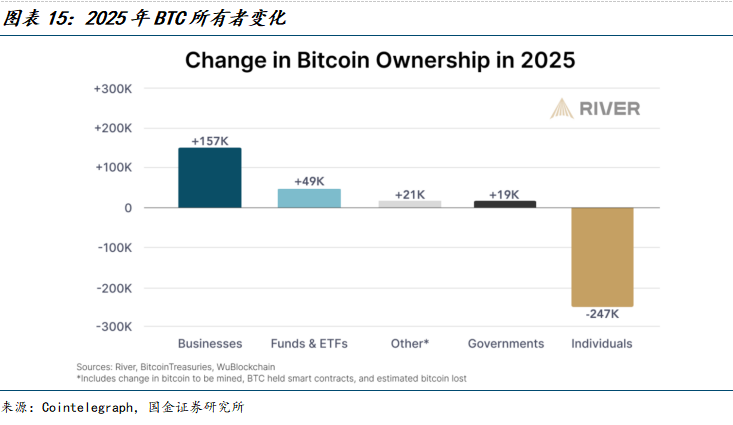 根据Cointelegraph,2025年1月1日-2025年5月12日,以MSTR为代表的企业购买的比特币数量超过任何其他类别投资者,企业整体持有量增加15.7万枚BTC。继企业之后的第二大买家是ETF,BTC持有量增加4.9万枚。第三大主体是政府,增加约1.9万枚BTC。相反,散户或个人投资者今年的BTC持有量减少24.7万枚。