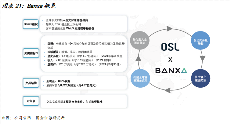 2024年11月,OSL收购日本CoinBest株式会社并于2025年1月公告完成收购。2025年3月,完成意大利目标公司收购,获得欧洲市场数字资产牌照。在澳洲市场,OSL AU Pty Ltd获得由澳洲交易报告与分析中心(AUSTRAC)颁发的注册数字货币交易所牌照,为机构客户提供场外交易服务。2025年6月,OSL拟收购印尼Evergreen Crest Holdings Ltd以获取Evergreen及其附属公司持有的印尼期货经纪商牌照和加密货币交易商牌照。2025年6月,OSL拟收购Banxa,Banxa在全球拥有40+牌照/注册资质(详情见图表21)。2025年8月,子公司OSL Bermuda Limited已正式获得百慕大金融管理局(BMA)颁发的数字资产业务F级全牌照。