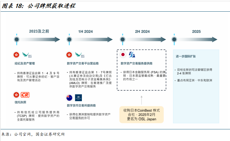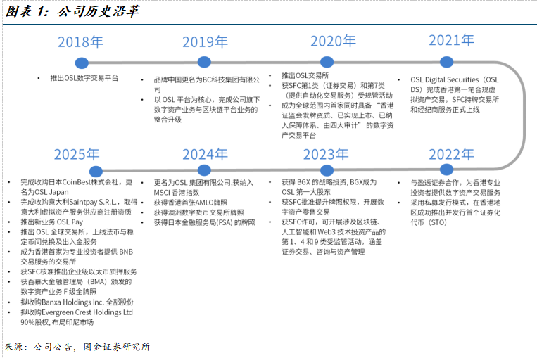 OSL集团是虚拟资产领域“合规化+全球化”的标杆企业,自2018年启动数字资产交易平台以来,持续走合规道路并实现产品突破。2024年,公司引进一批新的管理层,并实现转型数字资产领域以来的首次盈利。2025年,集团加速业务扩张及全球化布局:3月完成收购意大利Saintpay S.R.L.,取得意大利虚拟资产服务供应商注册资质;4月推出OSL Pay优化法币与加密货币兑换;6月宣布拟收购Banxa以整合全球出入金通道网络;7月上线企业支付服务OSL Biz Pay;8月获得百慕大金融管理局(BMA)颁发的数字资产业务F级全牌照(Class F license)。