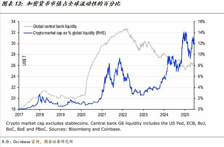 根据CoinGecko的统计,截至2025年9月13日,加密资产总市值约4.2万亿美元,较2025年初上涨23%。根据Coinbase报告,加密货币市值占全球流动性的百分比正在上升,并认为加密货币的价格表现会在2025年下半年创下历史新高。