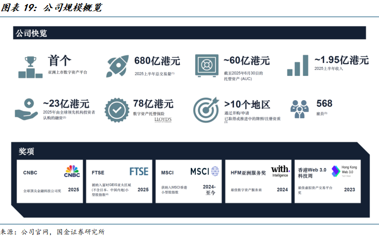 公司自2018年开创数字资产交易平台,持续走合规路径。2024年,公司引进一批新的管理层,并实现转型数字资产领域以来的首次盈利。今年以来,持续加速业务扩张(PayFi)及全球化布局,公司6月宣布拟收购Banxa,完成Banxa收购后,叠加已获取的牌照,将在日本、欧盟、澳大利亚、英国等10个地区持有超过50项牌照及注册资质,且正在推进中东等市场的牌照申请工作。公司营收构成主要包括数字资产交易收入,25H1,该业务占比总收入51%。25H1,实现交易量682亿港元,yoy+200%;截至25H1末,托管资产达到57亿港元,yoy+50%。25H1,公司持续经营业务亏损0.2亿港元,主要系公司全球扩张计划导致人数以及经营开支增加。