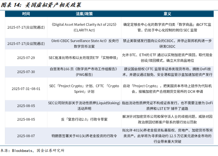 2025年7月,SEC批准比特币和以太坊现货ETF实物申赎;白宫发布《数字资产市场工作组报告》;SEC启动“project crypto”计划,旨在将证券规则现代化,使美国资本市场上链,SEC 将制定明确的加密资产发行、托管和交易规则,并在规则完善前使用解释和豁免权确保传统规则不阻碍创新。