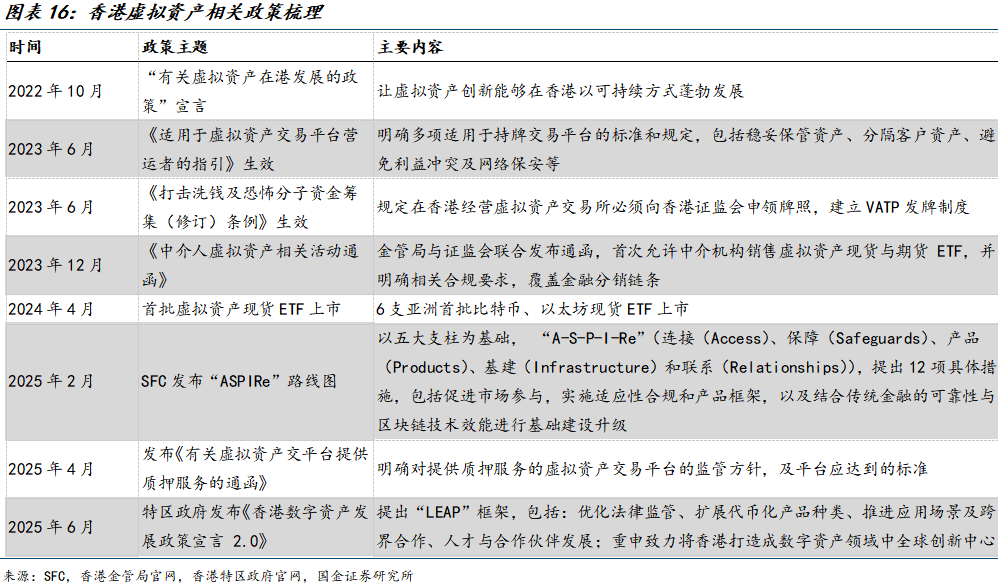 2022年10月,SFC发布“有关虚拟资产在港发展的政策”宣言,指出“让虚拟资产创新能够在香港以可持续方式蓬勃发展”。2023年6月,《打击洗钱及恐怖分子资金筹集(修订)条例》生效,强调虚拟资产交易平台(VATP)须持牌经营。2024年4月,亚洲首批虚拟资产现货ETF落地香港。2025年2月,SFC发布“ASPIRe”路线图,围绕连接、保障、产品、基建和联系五大核心支柱,规划了12项主要措施,以构建更安全、创新、开放的虚拟资产市场。2025年6月,特区政府发布《香港数字资产发展政策宣言2.0》,提出“LEAP”框架,重申致力将香港打造成数字资产领域中的全球创新中心。
