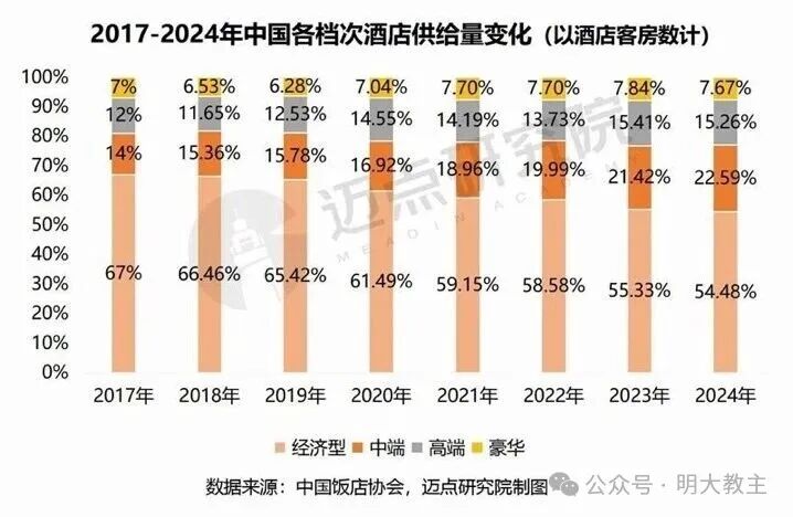对于消费者来说,多项权威统计数据显示,居民出行意愿增强,但是出行花费金额却没有显著增长。核心就是,消费者都爱“精打细算”了。而中端酒店,恰恰是一部分用户消费降级和一部分用户消费升级后的汇合地带。
