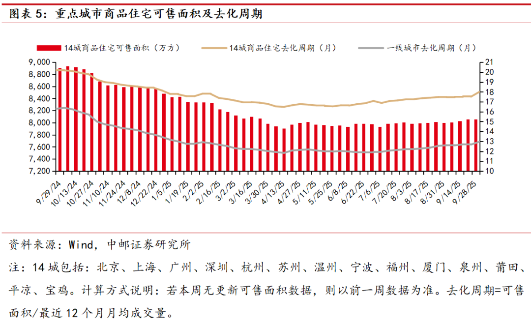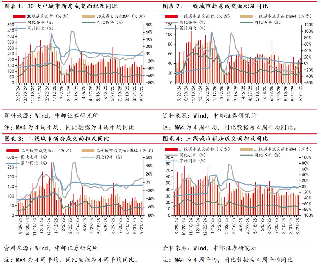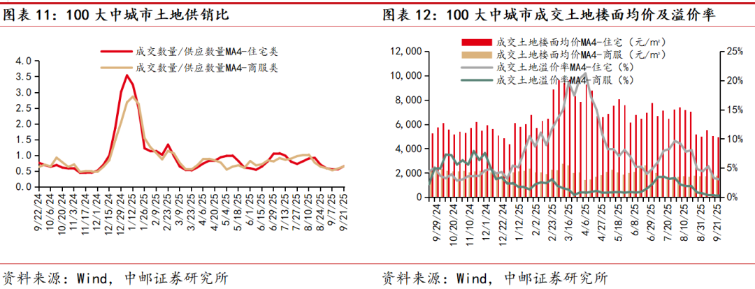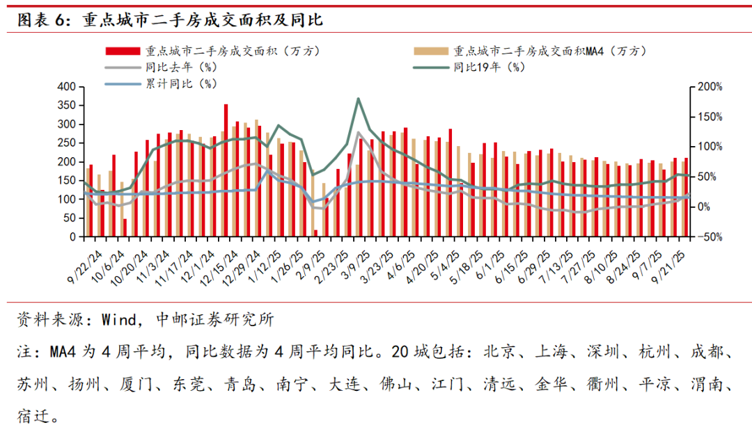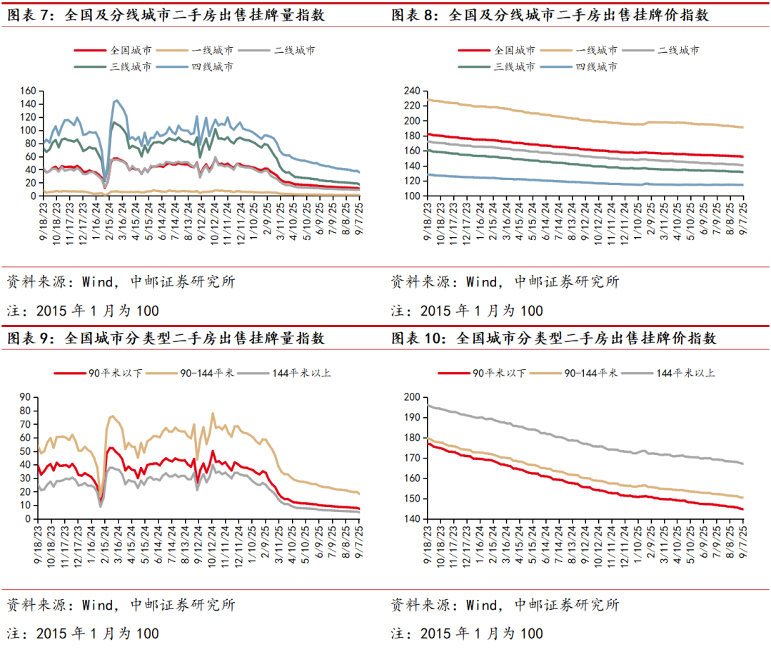 (2)二手房成交及挂牌:上周20城二手房成交面积为211.36万方,本年累计二手房成交面积为8191.56万方,累计同比+16%。20城近四周平均成交面积为201.4万方,同比+21.5%,环比+0.6%。截至2025/9/8全国城市二手房出售挂牌量指数为10.87,环比-9.6%,挂牌价指数为151.88,环比-0.17%。