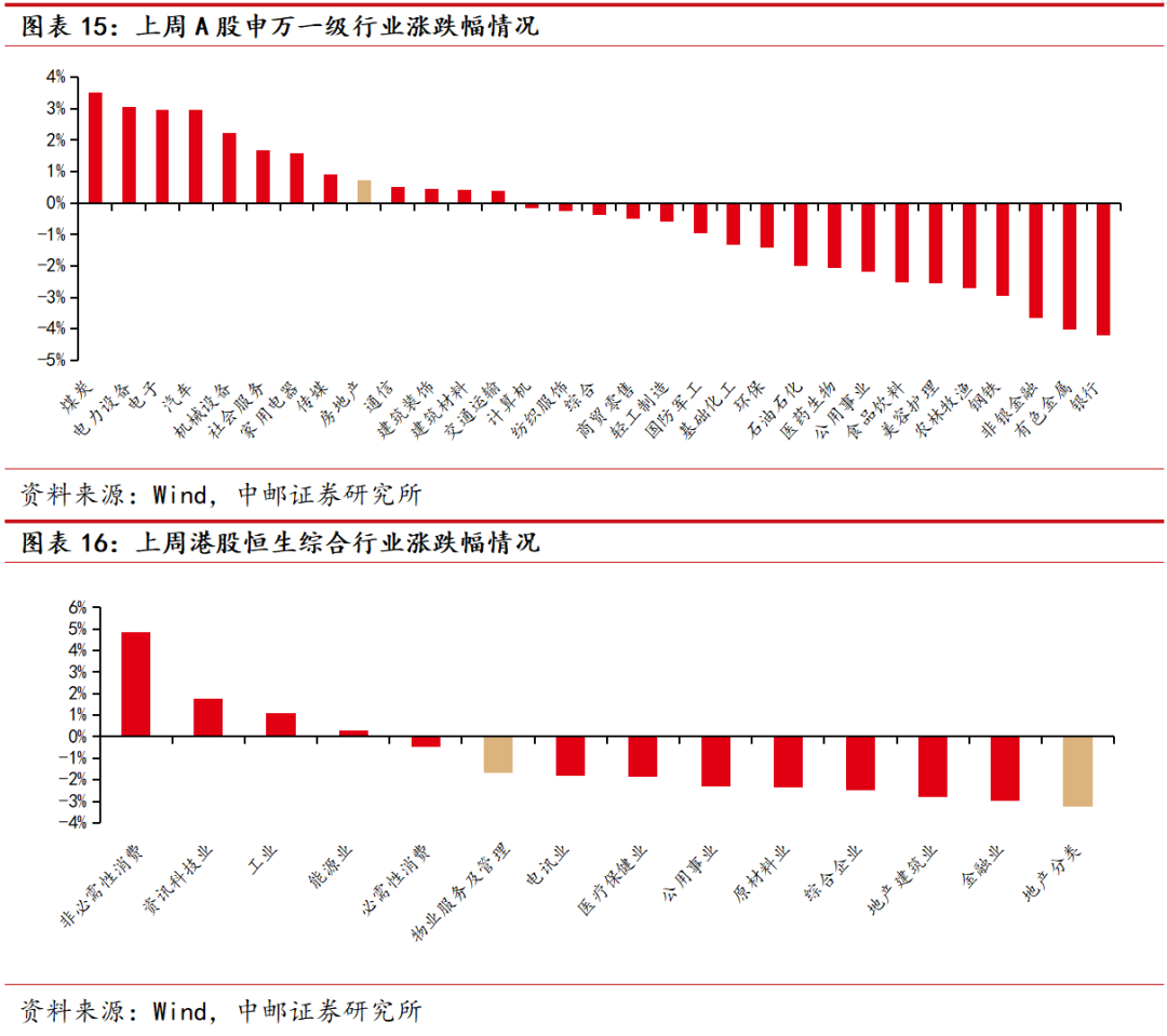 从行业排名来看,上周A股房地产在31个申万一级行业中排名第9,港股地产分类、物业服务及管理在14个恒生综合行业中分别排名第14、第6。