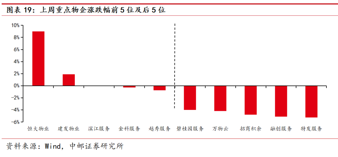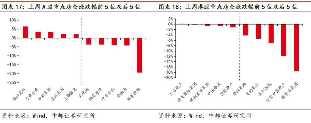 上周重点A股房地产个股涨幅居前的分别为:张江高科(+6.5%)、万业企业(+3.48%)、中新集团(+3.33%),重点港股房地产个股涨幅居前的分别为:太古地产(+0.18%)、建发国际集团(-0.17%)、保利置业集团(-0.58%),重点物业服务企业涨幅居前的分别为:恒大物业(+9.01%)、建发物业(+1.91%)、滨江服务(+0%)。