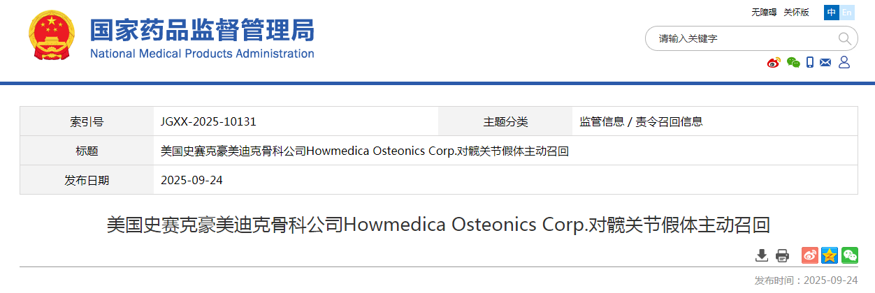 史赛克(北京)医疗器械有限公司报告,由于不同批次规格产品混淆的原因,生产商美国史赛克豪美迪克骨科公司Howmedica Osteonics Corp.对其生产的髋关节假体EXETER Total Hip System(国械注进20173130477)主动召回。召回级别为三级召回。涉本次召回涉及的产品未进口至中国,具体型号、规格及批次等详细信息见《医疗器械召回事件报告表》。