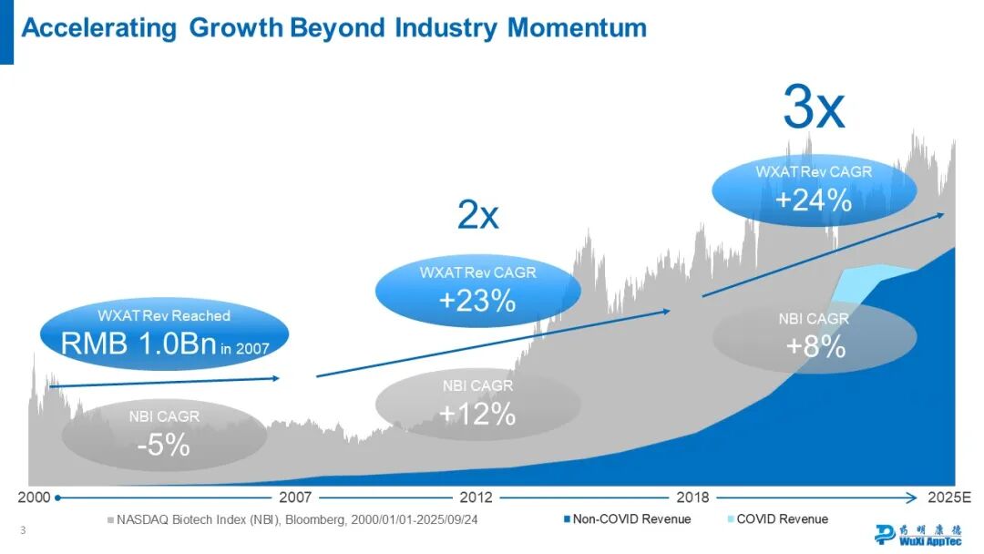 施明女士首先回顾了药明康德在25年发展历程中的财务表现。跟随着科学的突破与行业的发展,药明康德从早期的CRO平台逐步演进到今天独特的CRDMO一体化平台。在此过程中,受行业需求以及自身独特商业模式的共同驱动,药明康德的收入展现出超越行业趋势的快速增长。2007-2018年期间,药明康德收入的复合增长率为23%,而同期反映全球新药研发趋势和投资金额的NBI(NASDAQ Biotech Index)行业基准指数复合增长为12%。2018年至今,药明康德收入的复合增长率为24%,更是达到NBI复合增长率的3倍。