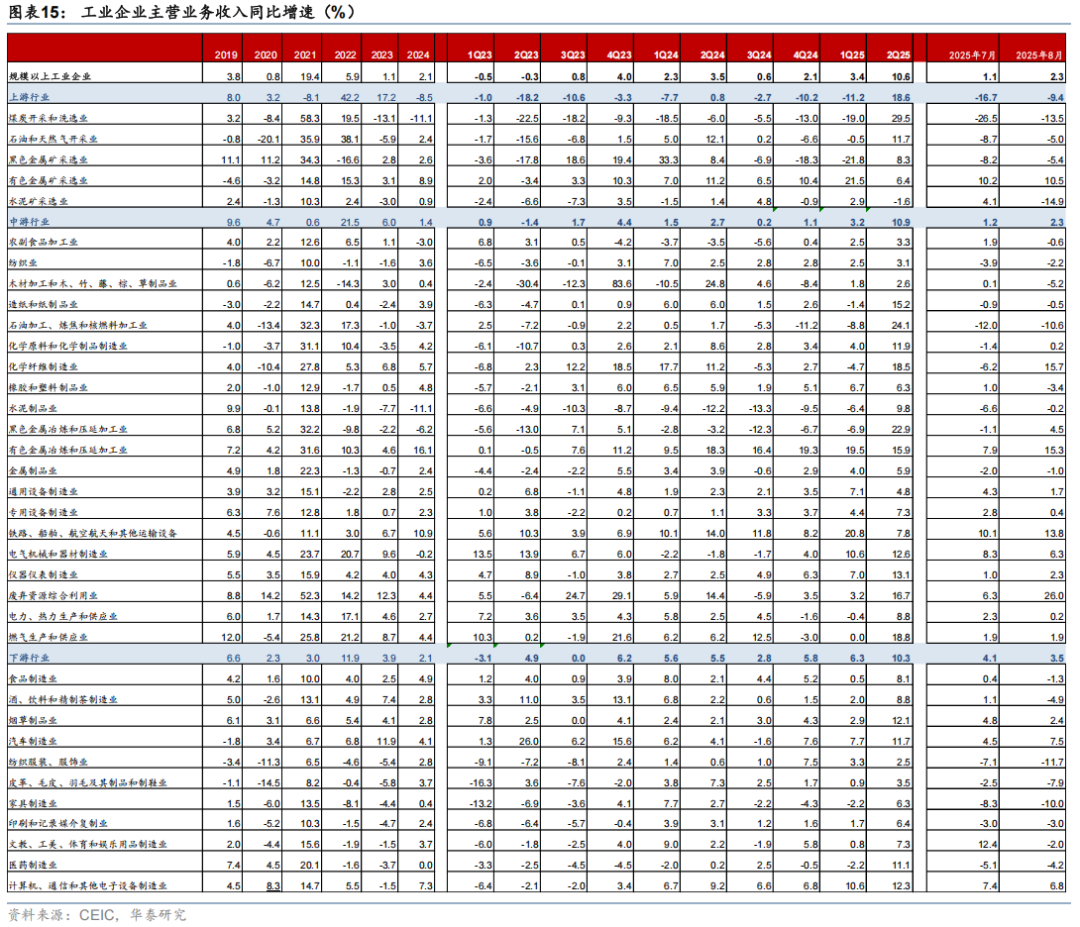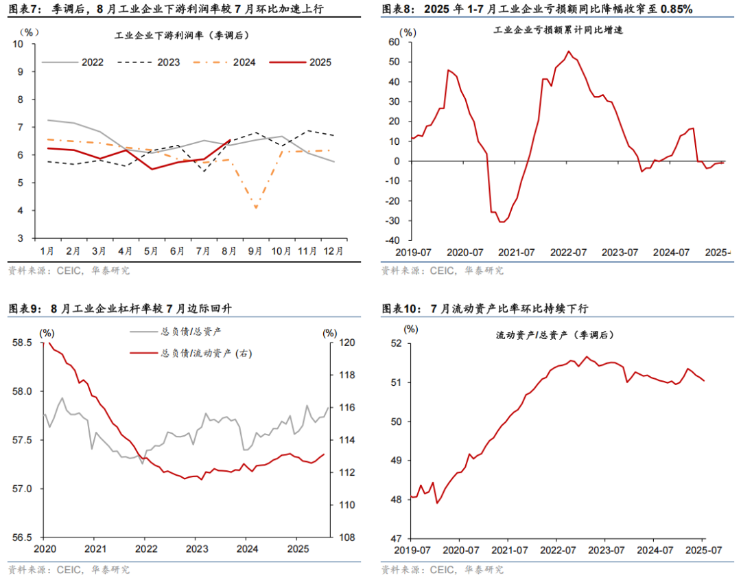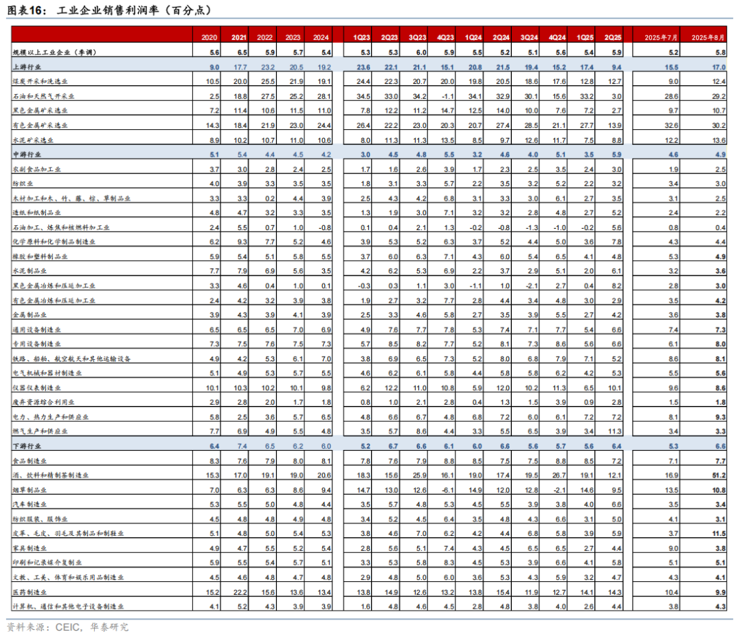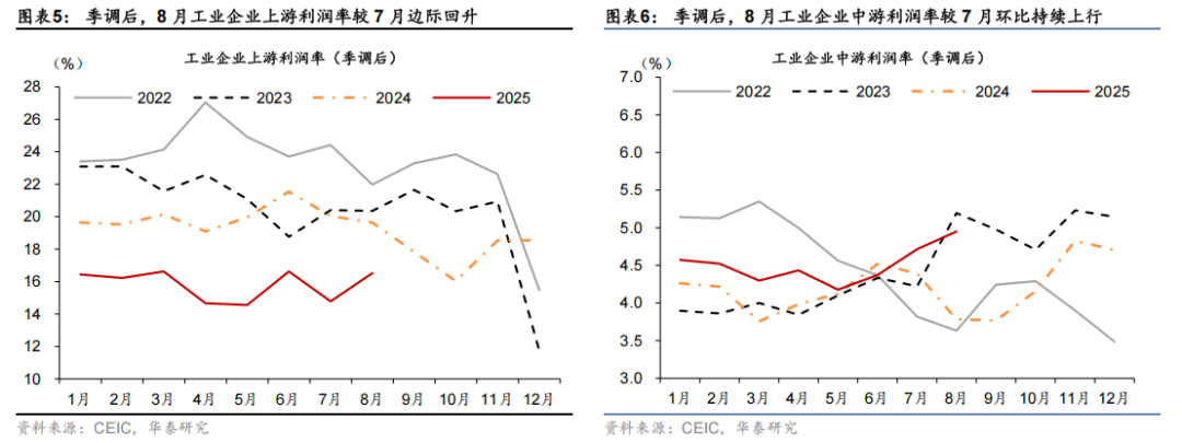 低基数下中游制造业利润回暖,同比增速较7月的9.3%大幅上涨至36.9%,需求及价格因素均有贡献。其中营收同比增速较7月的1.2%增至2.3%、延续7月以来的改善态势,季调后利润率从7月的4.7%回升至5%。分行业而言,低基数提振下,电气机械/专用设备等出口链行业利润增速分别从7月的4.8%/-4.7%改善至10.2%/37.8%。电力热力供应行业盈利同比增速较7月的9.7%进一步上升至62.6%,对整体工业企业利润增速的贡献约为6.1个百分点,或主要受益于利润率的提升。此外,反内卷政策推进下,带动水泥/橡胶/化学制品利润同比从7月的-6.7%/-9.9%/-1.9%回升至23.4%/-8.6%/14.9%。此外,有色金属/造纸业/农副食品加工业盈利同比均从7月的2%/-24.9%/-23.1%回升至60.5%/18.7%/-2.5%。