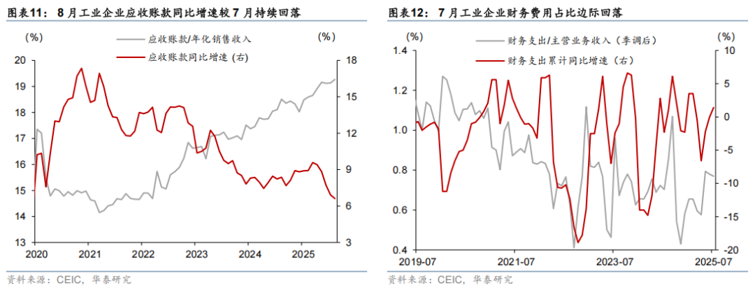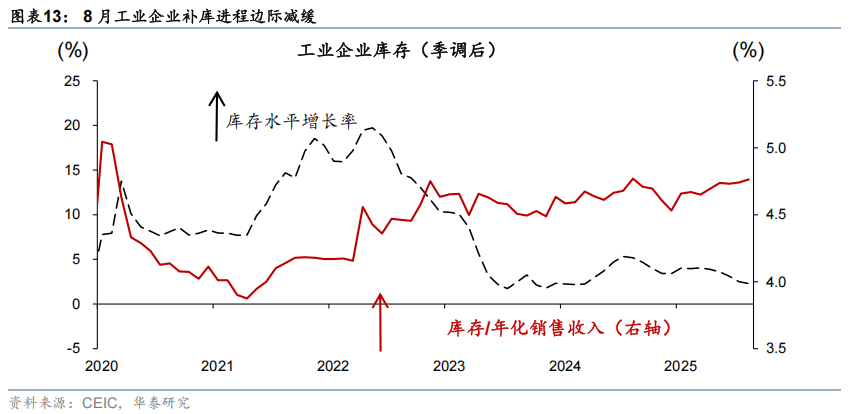 8月库存增速(季调后)从7月的2.4%回落至2.3%,或显示工业企业补库进程边际放缓;工业企业杠杆率(季调后)较7月略上行至57.8%,应收账款占销售收入比例亦边际上行至19.3%。