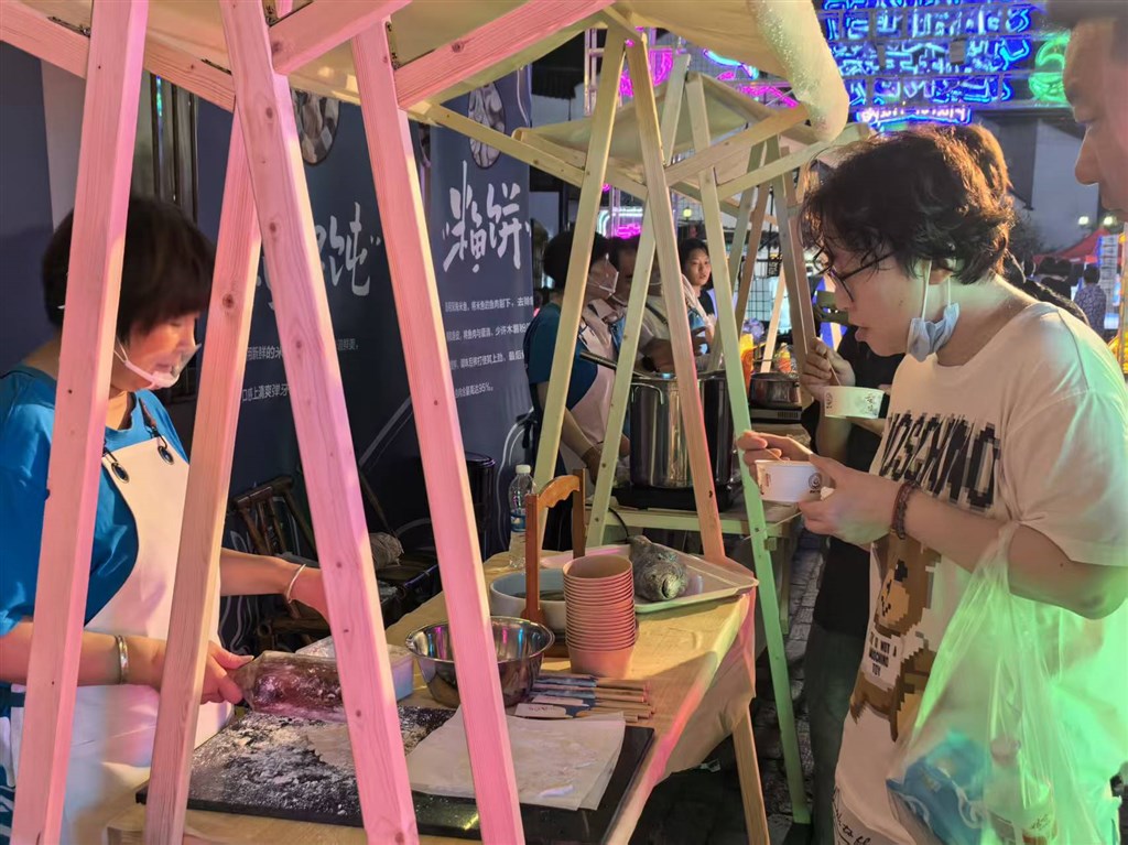 此外,一旁的“渔味无穷”特色点心集市更是香气四溢,米鱼饼、海鲜一尺面、黄鱼春卷等20多种特色小吃,让游客切实感受到“渔味无穷”。这种“可感知、可参与、可消费”的活态传承体系,已让金山嘴渔村累计吸引游客78万人次,实现营收1.2亿元,真正让非遗“活”起来,走进大众生活。