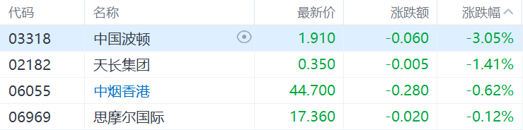 烟草及电子烟股全线下跌,中国波顿跌3.05%,中烟香港、思摩尔国际跟跌。