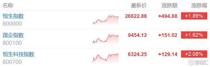 9月29日,港股三大指数午后涨幅再度加大,在券商、保险、地产拉升助力下跌,恒生指数最终收涨1.89%上扬近500点,再度重回26500点上方,国企指数涨1.62%,恒生科技指数涨2.08%,三者近乎收回上周五跳水跌幅。