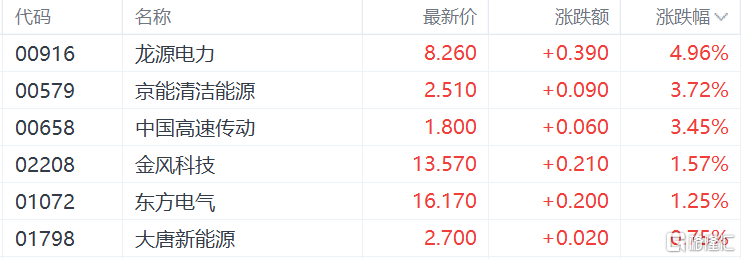 风电股延续上涨行情,龙源电力涨近5%,金风科技涨1.57%,大唐新能源涨0.75%。