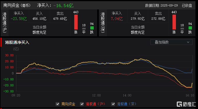 今日,南向资金净卖出16.54亿港元,其中港股通(沪)卖出23.58亿港元,港股通(深)净买入7.04亿港元。