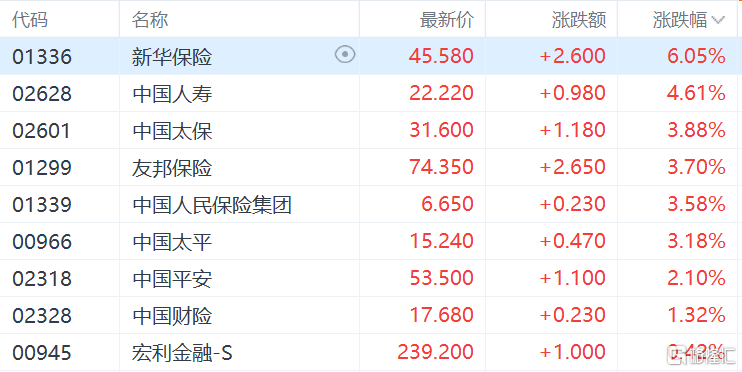 保险股中,新华保险涨超6%,中国人寿涨超4%,中国太保、友邦保险、中国太平涨超3%。