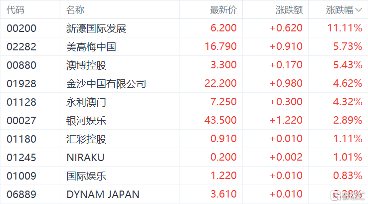 濠赌股齐涨,新濠国际发展涨超11%,美高梅中国、澳博控股涨超5%,金沙中国、永利澳门涨超4%。