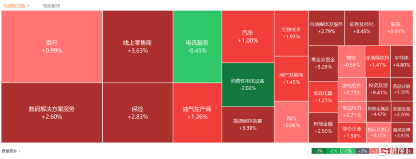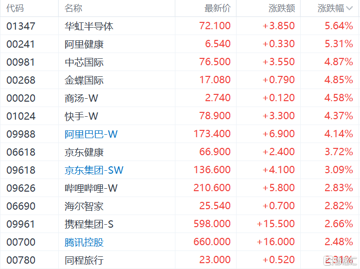 大型科技股回暖助力大市上涨,阿里巴巴、快手涨超4%,京东涨超3%,腾讯、美团涨超2%。