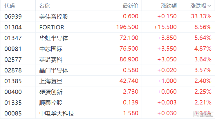 半导体板块表现活跃,华虹半导体涨5.64%,中芯国际涨4.87%,晶门半导体涨3.57%,上海复旦涨2.4%。